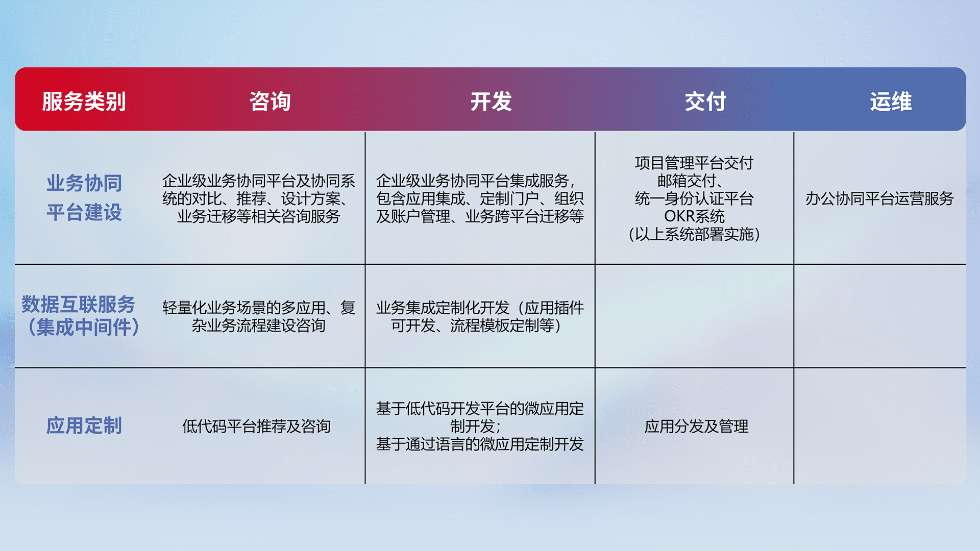 针对钉钉、、企微、、IDaas等平台级产品提供产品的规划、、方案、、交付、、、、定制化开发等服务,,实现如统一协同办公、、、、智能客户服务、、、、混合会议管理、、、智能数据查询、、等业务场景,,实现数字化转型。。